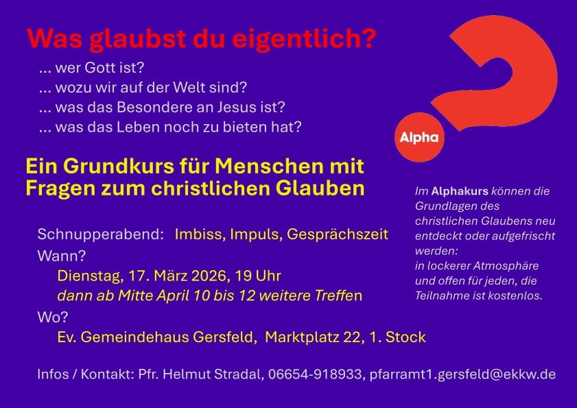 | 22.02. | 09:30 Uhr | Gottesdienst mit Abendmahl | Pfarrer H. Stradal |