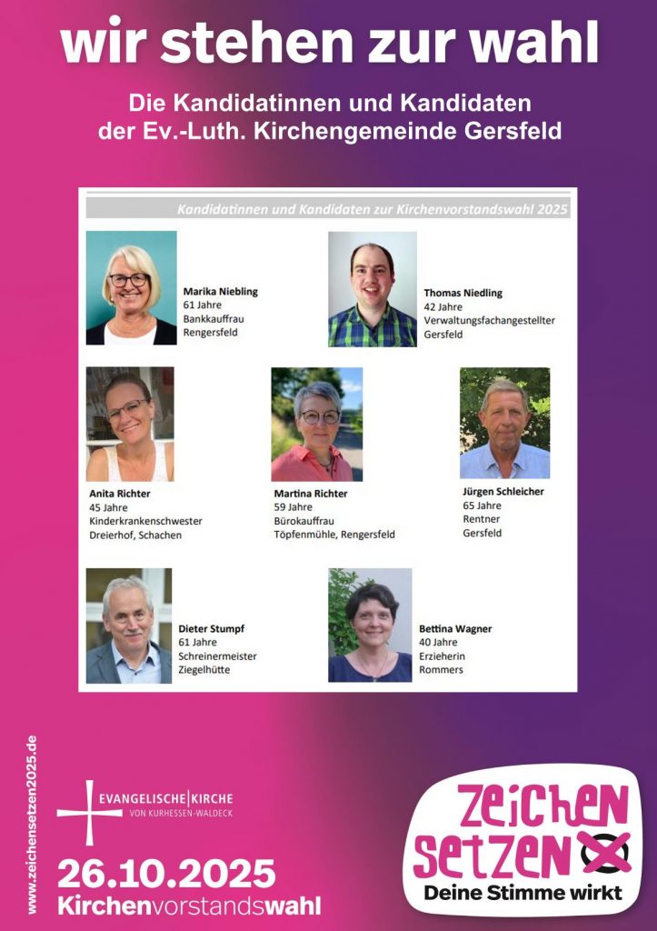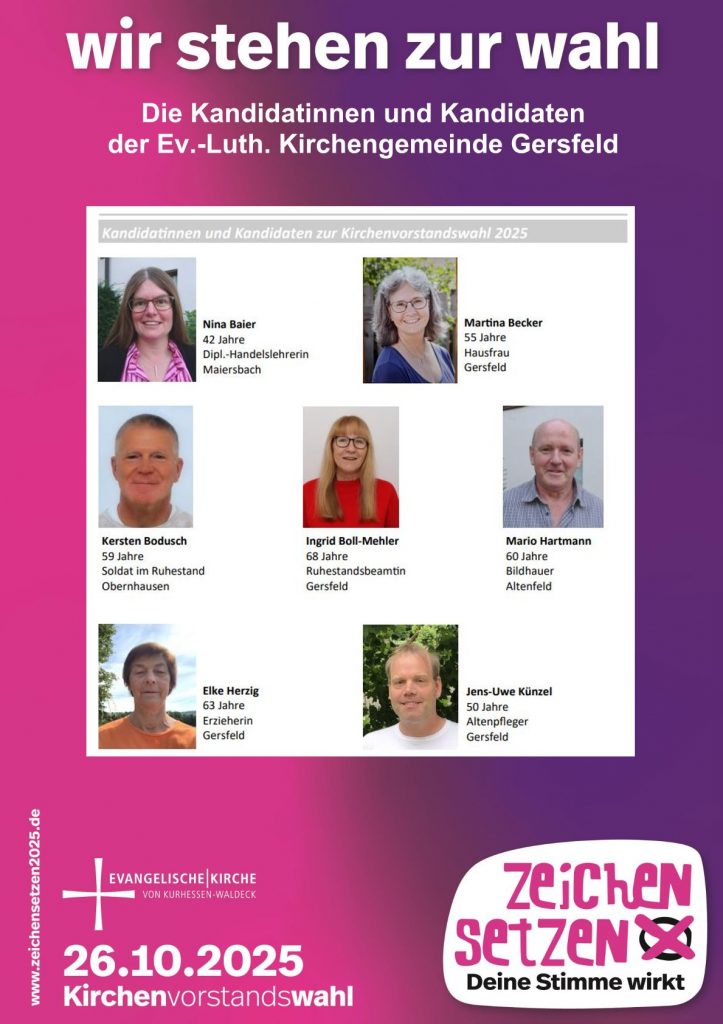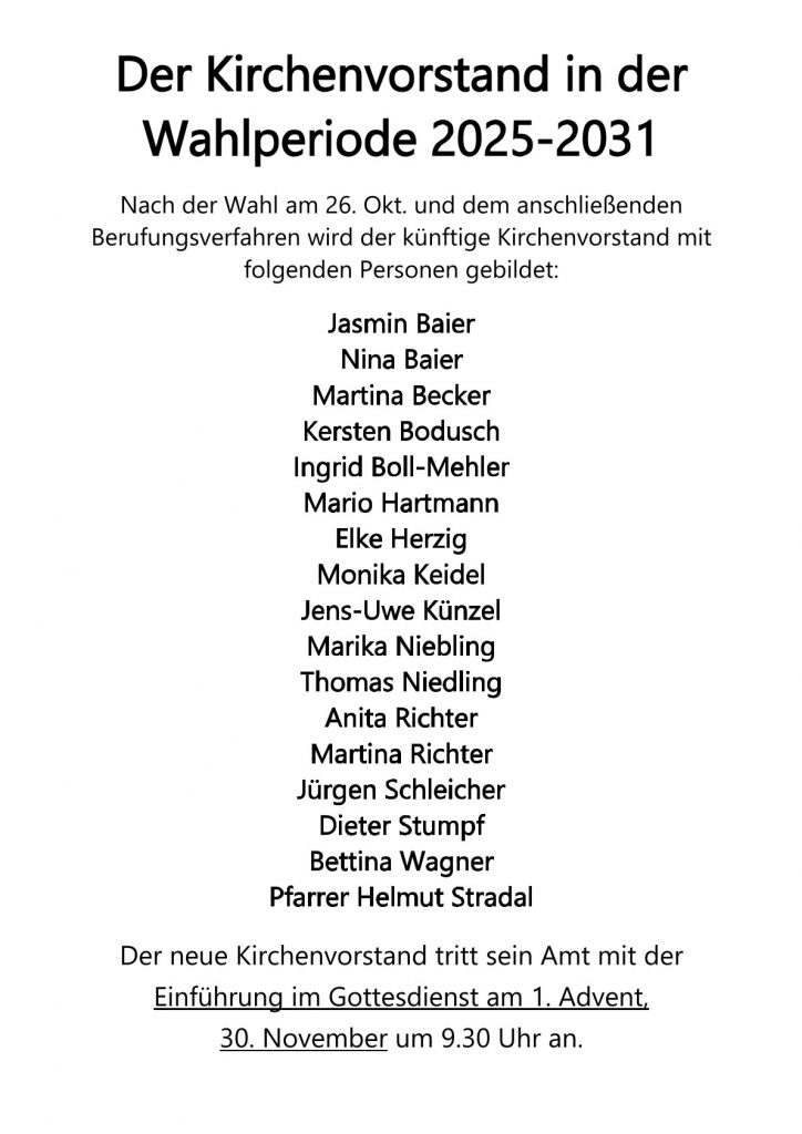 Nina Baier (Finanzausschuss, Konfirmandenarbeit, Ökumenetreffen), Martina Becker, Lektorin (Diakonieausschuss, Liturgieausschuss, Friedhofsausschuss), Kersten Bodusch (Bauausschuss, Friedhofsausschuss, Konfirmandenarbeit), Ingrid Boll-Mehler (Diakonieausschuss), Karin Frey (Diakonieausschuss, Kooperationsraumausschuss, Konfirmandenarbeit), Gabi Gleichmann (Gemeindebrief, Finanzausschuss), Horst Günther (Vorsitzender Kirchenvorstand), Klaus Grösch (Bauausschuss, Friedhofsausschuss), Ilse Gutmann-Friedel (Kreissynode, Diakonieausschuss), Peter Hadamczik-Trapp (nicht auf dem Foto), Mario Hartmann (Bauausschuss, Friedhofsausschuss), Elke Herzig (Kooperationsraumausschuss, Diakonieausschuss, Friedhofsausschuss), Ulrike Hohmann, Lektorin (Liturgieausschuss, Friedhofsausschuss), Marika Niebling (Kreissynode, Konfirmandenarbeit, Finanzausschuss, Friedhofsausschuss), Uwe Niebling (Friedhofsausschuss, Bauausschuss), Thomas Niedling (Finanzausschuss, Ökumenetreffen), Dieter Stumpf (Friedhofsausschuss, Bauausschuss) und Bettina Wagner (Friedhofsausschuss, Gemeindebrief) sowie Gerhard Ufholz (Kirchenältester) und Helmut Stradal (Pfarrer)