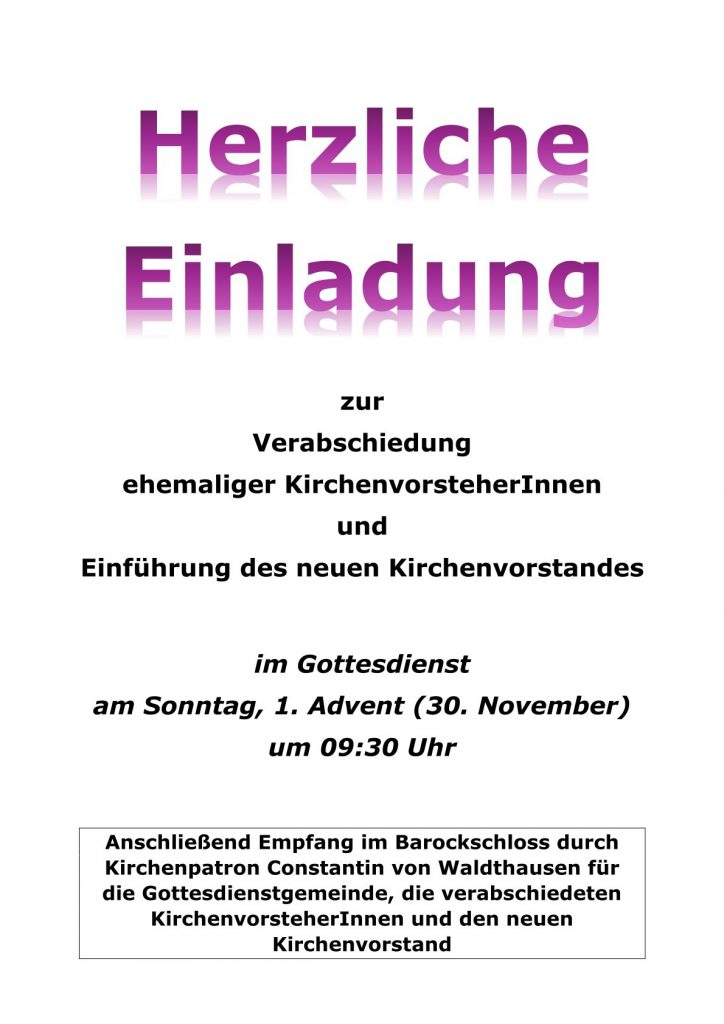 | 30.11. | 09:30 Uhr | Gottesdienst mit Verabschiedung des ehemaligen und Einführung des neuen Kirchenvorstandes | Pfarrer H. Stradal |